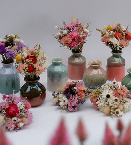 Shop our range of ready to display hand made pottery bud vases with thoughtfully crafted posies to match.