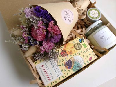 Gift box includes :- Classic dried flower bouquet - Pink and purple tones, Approximately 12cm wide & 22cm tall.