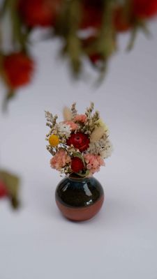 A gorgeous hand made pottery bud vase in Autumn tones, with a perfectly created mini bouquet to match.