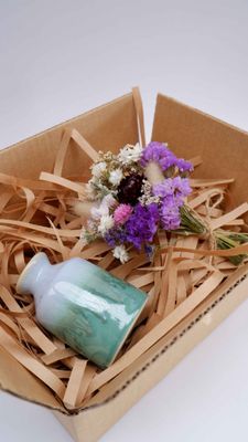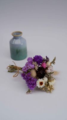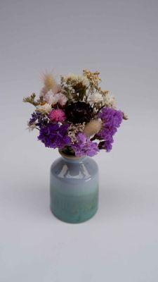A gorgeous hand made pottery bud vase in soft greens & misty blue , with a perfectly created mini bouquet in mauve tones to complement.