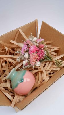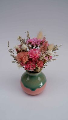 A gorgeous hand made pottery bud vase in coral and sage tones, with a perfectly created mini bouquet to match.